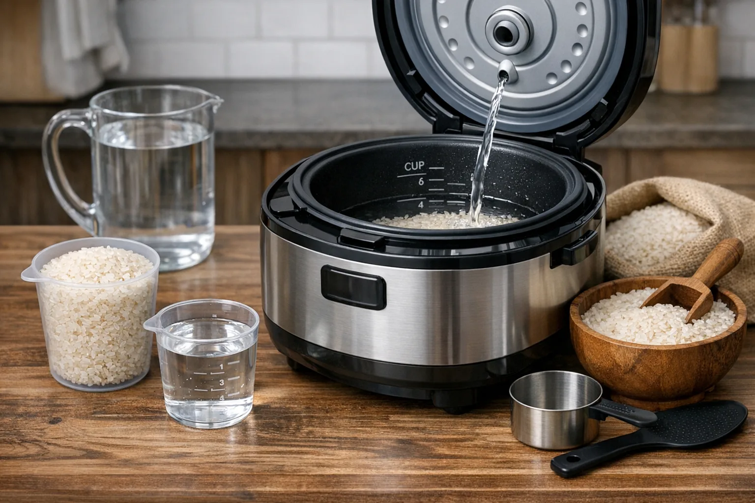Das Wasser-Reis-Verhältnis bestimmt die Struktur und das Volumen deines Reises. Im Reiskocher passiert der Garprozess durch Absorption und Dampf. Reis nimmt Wasser auf. Die Stärke quillt auf und die Körner werden weich. Moderne Reiskocher schalten über einen Thermostat ab, wenn das Wasser aufgebraucht ist. Danach bleibt der Reis in der Warmhaltefunktion. Deshalb ist die Anfangsmenge Wasser entscheidend für das Endergebnis.